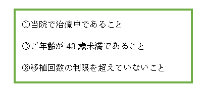 ③保険適用で実施できる移植回数も制限がございます。39歳以下で6回、40歳以上で3回までと定められていますので、その回数を超えたあとの延長は、自費でのお手続きになります。尚、卒院後、2人目希望でご来院された場合(※2)、移植回数はリセットされます。